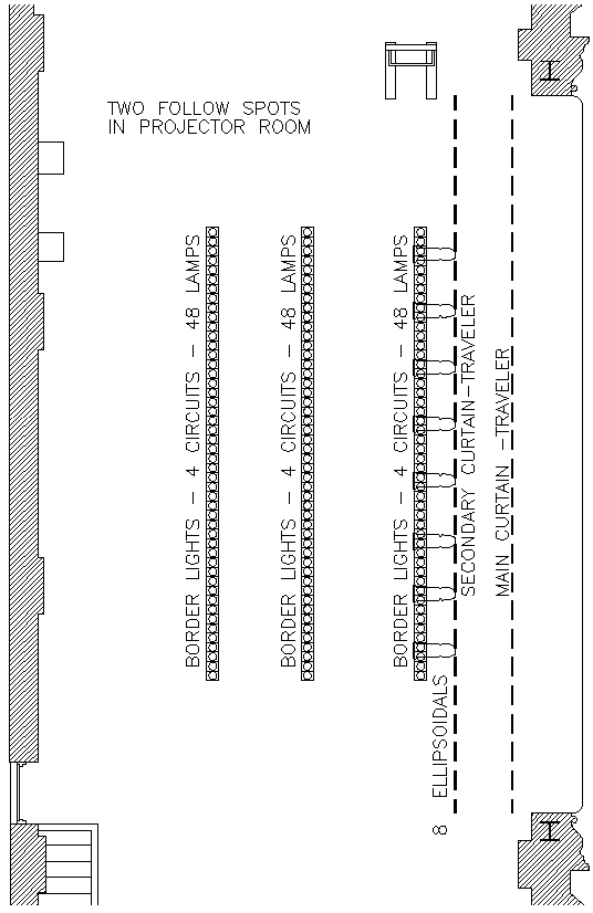 | Power: | 1- 200 amp panel (down stage left) 1 – 600 amp 240volt panel (up stage left) |